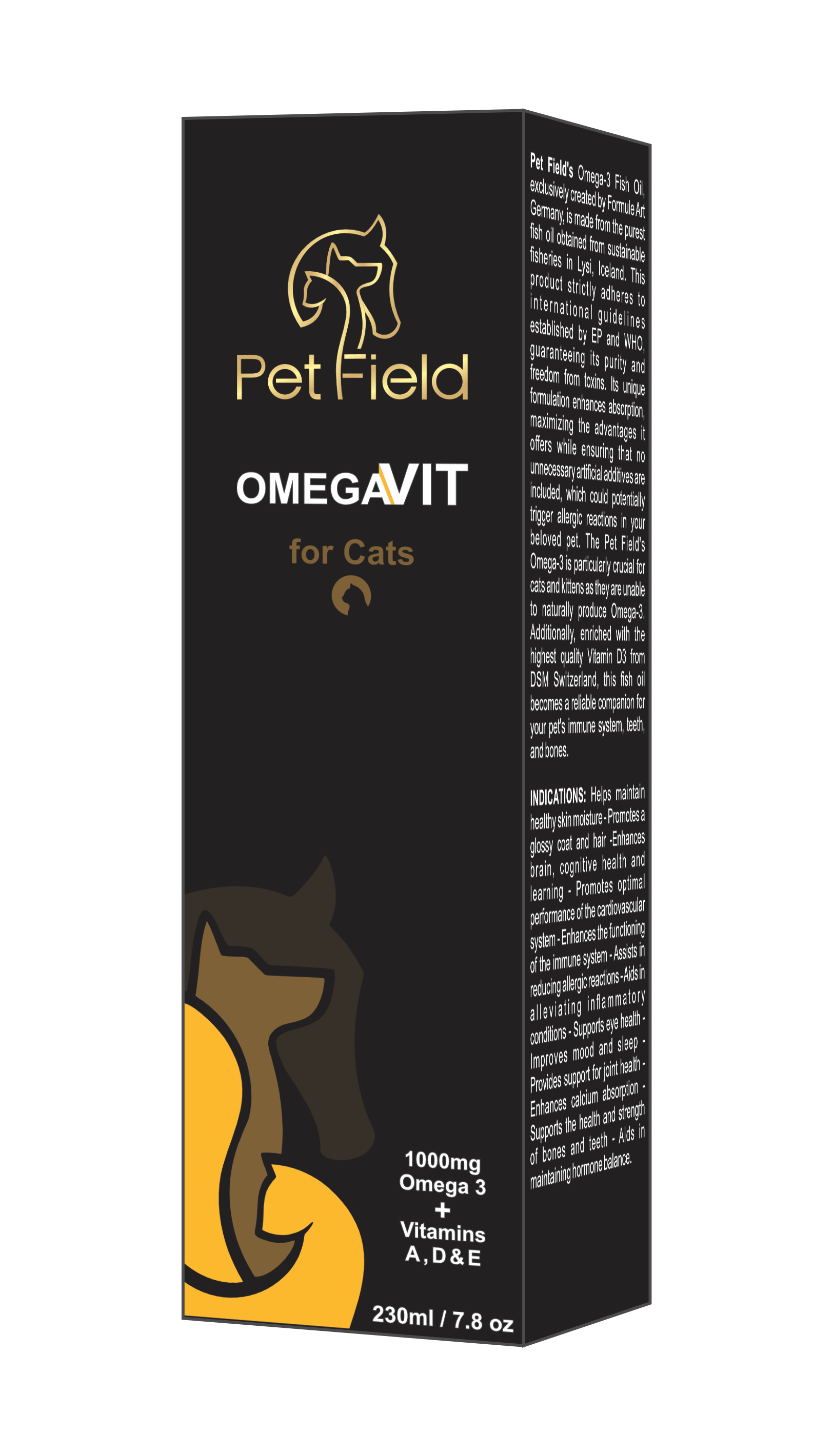 Treat your feline friend to the best in nutritional care with OmegaVit for Cats. Specially formulated with 1000 mg of pure Omega-3 sourced from sustainable fisheries by Lysi Iceland and enriched with Vitamins D3, E, and A from DSM Switzerland, this advanced supplement promotes optimal health and vitality. Exclusively crafted by Formule Art Germany and trusted by the PetField brand, OmegaVit for Cats supports your cat’s unique physiological needs, ensuring a healthier, happier life.